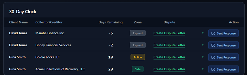 - Automated FDCPA Deadline Tracking: Eliminate the risk of missed deadlines with a precision 30-day countdown timer that triggers the moment a validation notice is logged, ensuring your client’s dispute rights are never waived.
