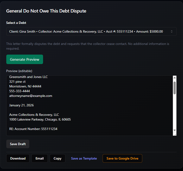 - Eliminate Costly Clerical Errors: Safeguard your firm’s reputation by auto-populating client data, account numbers, and creditor addresses directly from your CRM, ensuring every letter is accurate and professional.