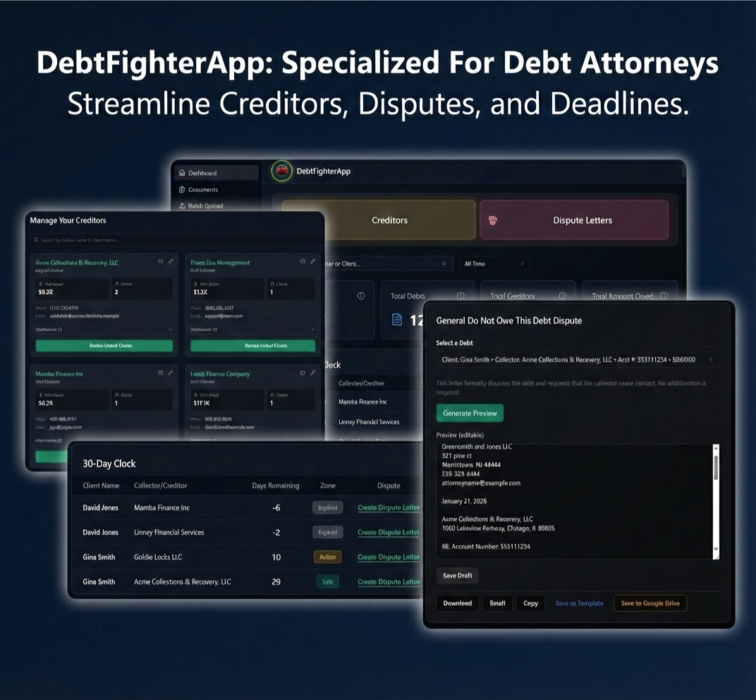 Eliminate the administrative bottleneck. DebtFighterApp streamlines the litigation lifecycle by combining a rapid-fire legal document generator with a robust CRM, allowing your team to manage client and creditor data while ensuring every letter meets firm standards via built-in approval protocols.