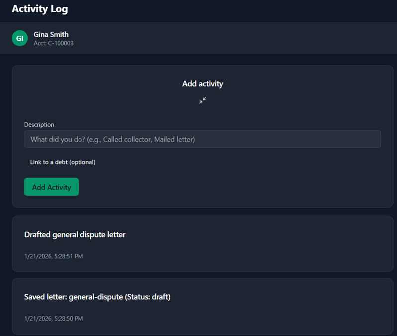 DebtFighterApp keeps an activity log of all the work you do within the application to help you keep track of days and times of interactions, so you do not have to.